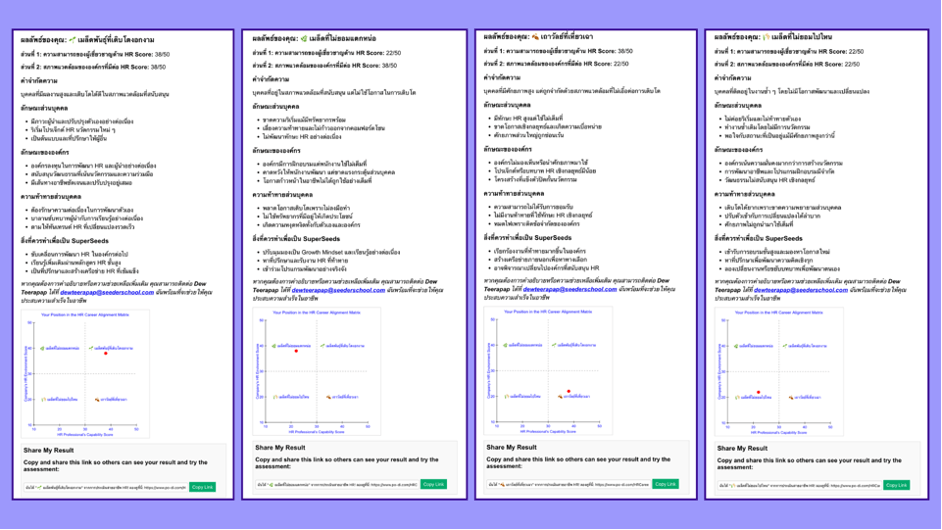ผลลัพธ์ที่ได้จากแบบทดสอบนี้ จะแบ่งผลออกมาเป็น 4 กลุ่ม ตามเกณฑ์ความสามารถที่มีในการทำงาน HR และการให้ความสนับสนุนหรือทิศทางขององค์กรที่มีต่องาน HR